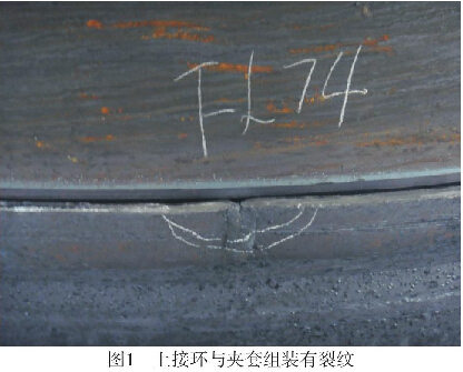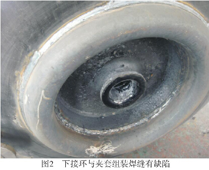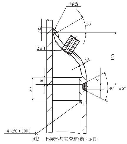 搪玻璃特種設(shè)備的上接環(huán)下接環(huán)與夾套組裝的對(duì)接接頭焊接過(guò)程、焊接質(zhì)量難以控制,圖1為上接環(huán)與夾套組裝有裂紋;圖2為下接環(huán)與夾套組裝有缺陷;圖3為上接環(huán)與夾套組裝的示意圖。