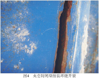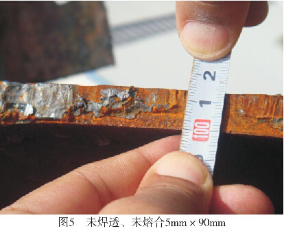 圖4是夾套封閉型組裝環(huán)縫開裂;圖5是搪玻璃特種設(shè)備使用過(guò)程中損壞后上接環(huán)與夾套組裝焊縫解剖后14mm的鋼板有Smm×90mm未焊透、未熔合現(xiàn)象。